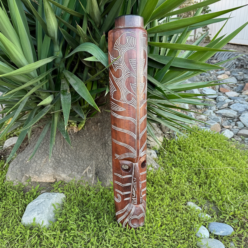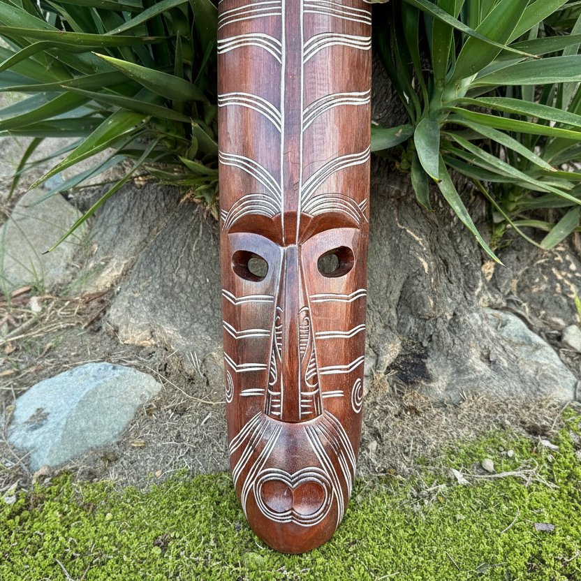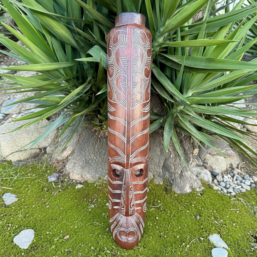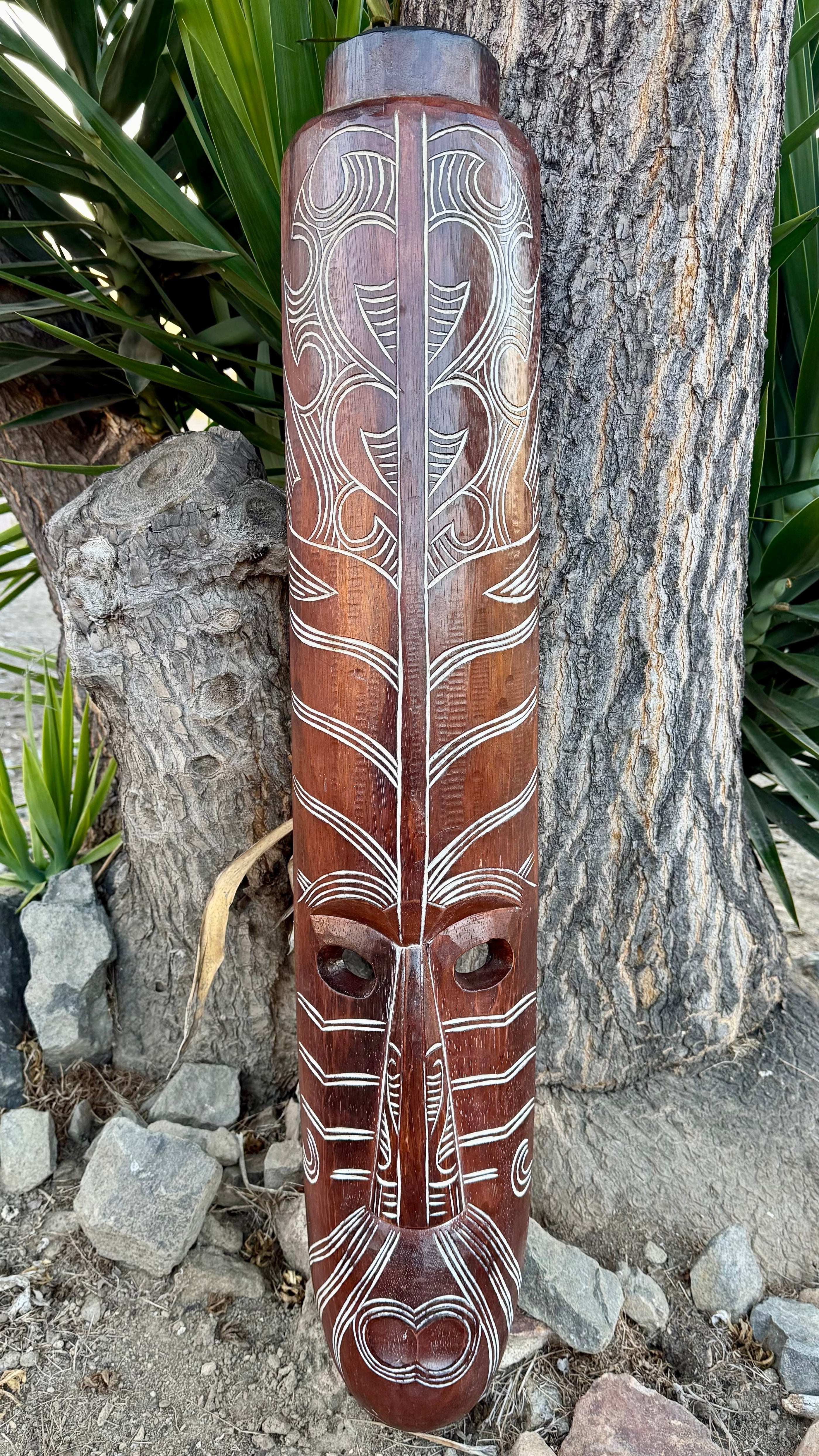 Maori style wooden tribal tiki mask inspired by the indigenous Polynesian people of New Zealand. This hand-crafted and painted mask would be a great addition to your home, patio, yard, or tiki bar. 39"x 7"