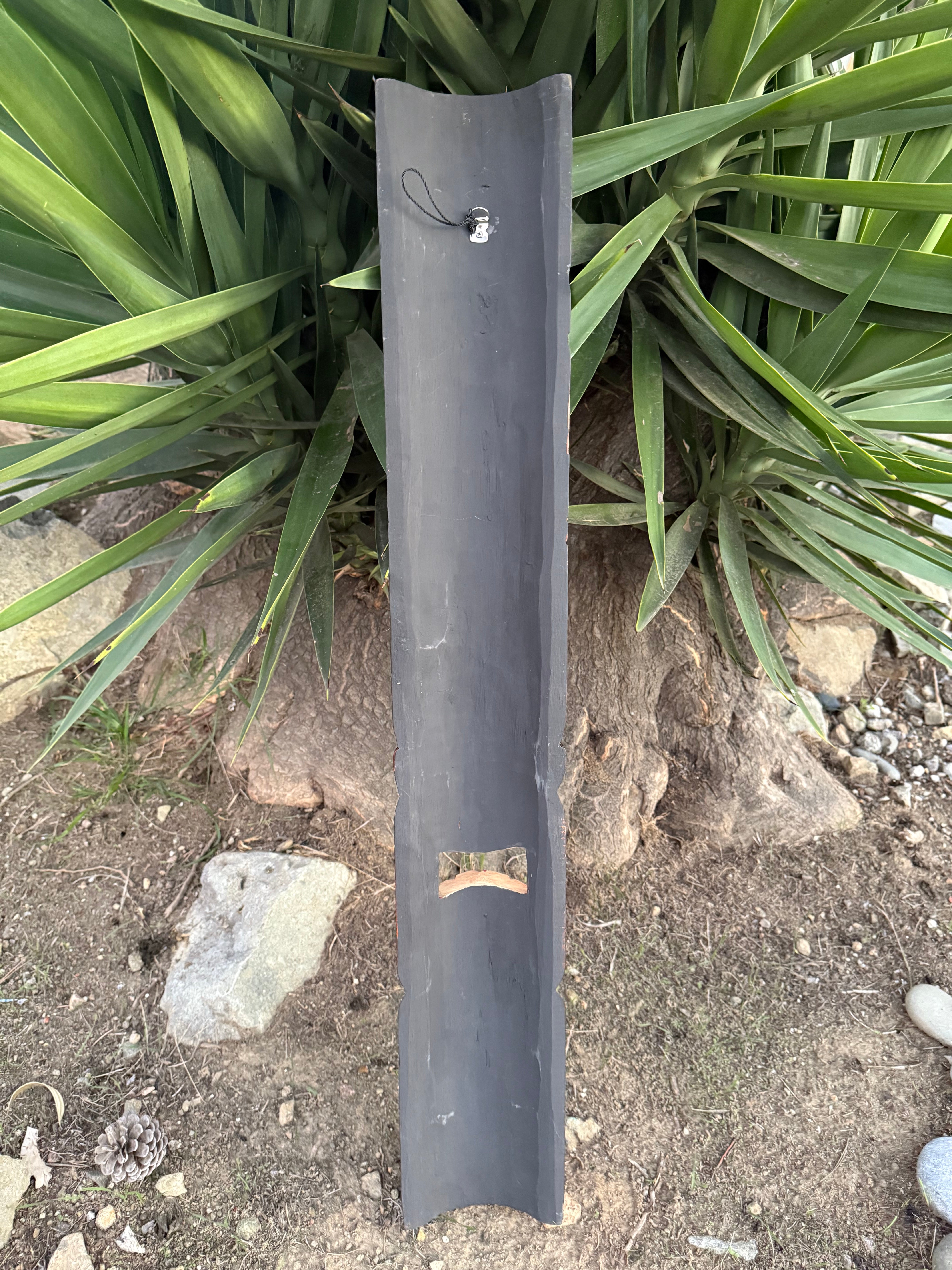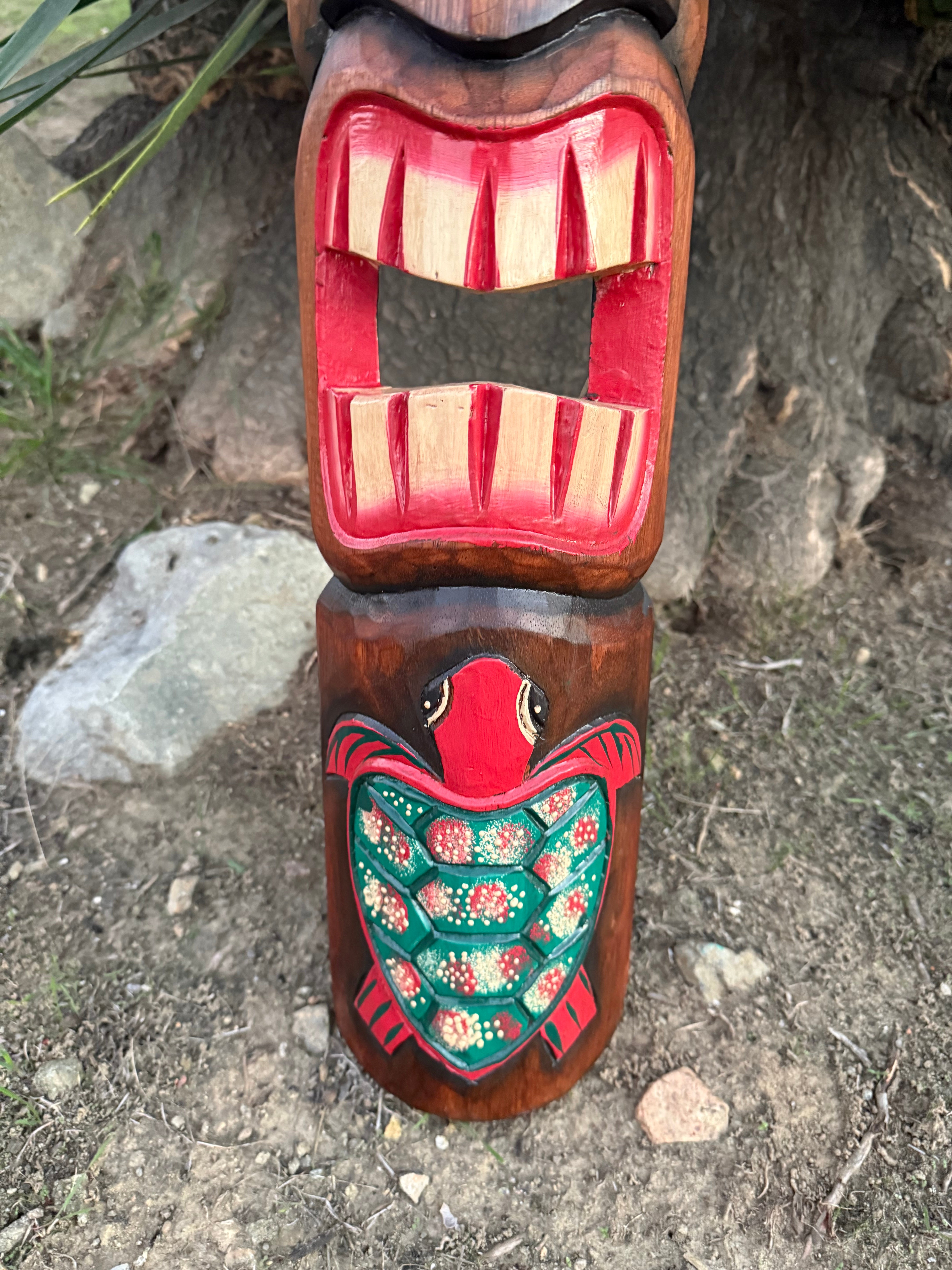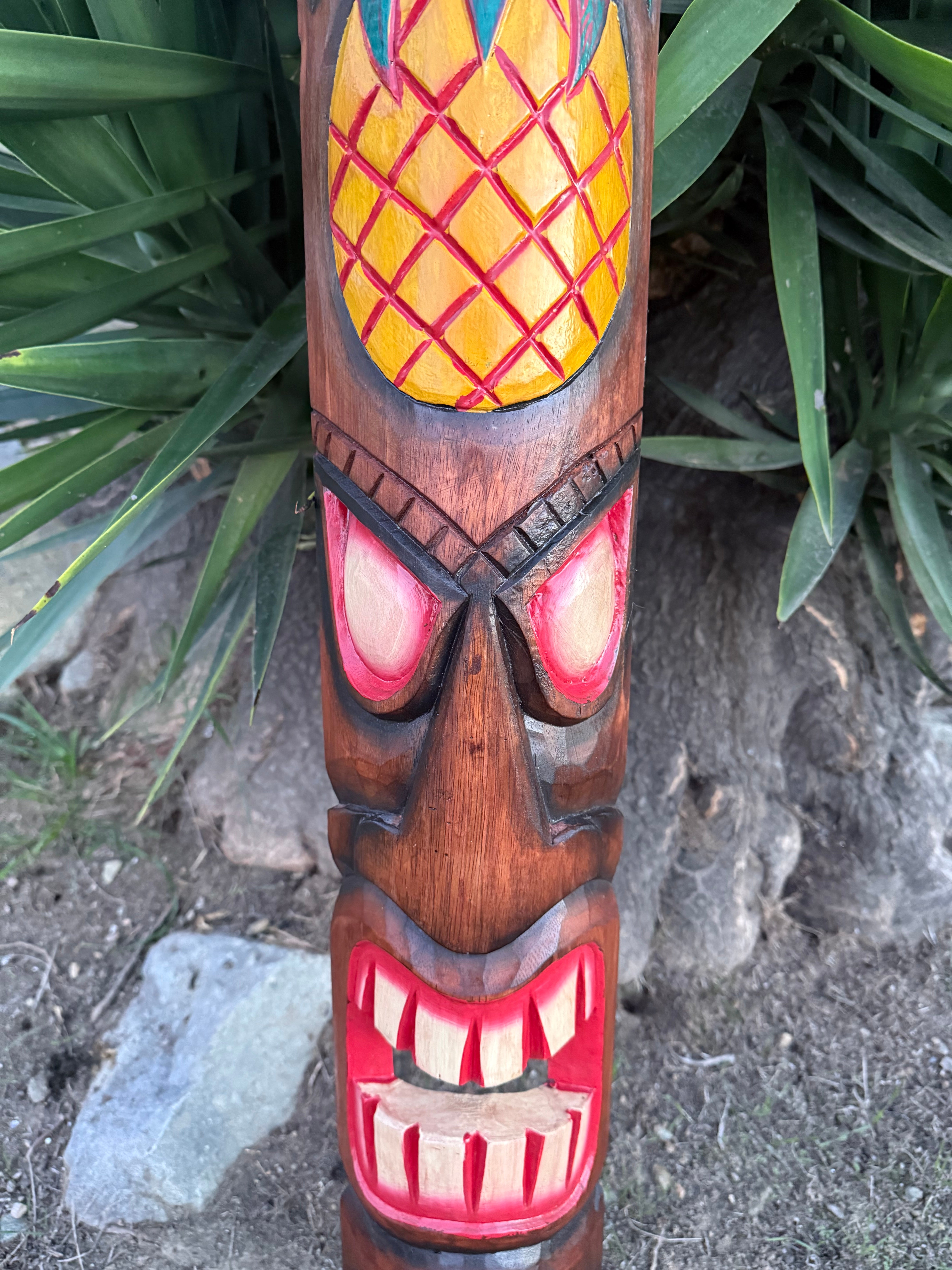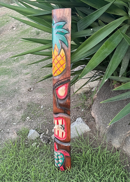 This hand-carved wooden tiki mask would make a great addition to your home, patio, yard, or tiki bar! These masks are beautifully hand crafted and painted with a pineapple and sea turtle. The backs of the masks are hallowed out to fit around poles, or can be hung flat up on the wall. This mask will make a great gift, or buy it for yourself! :) 39"x 6" inches