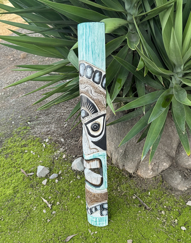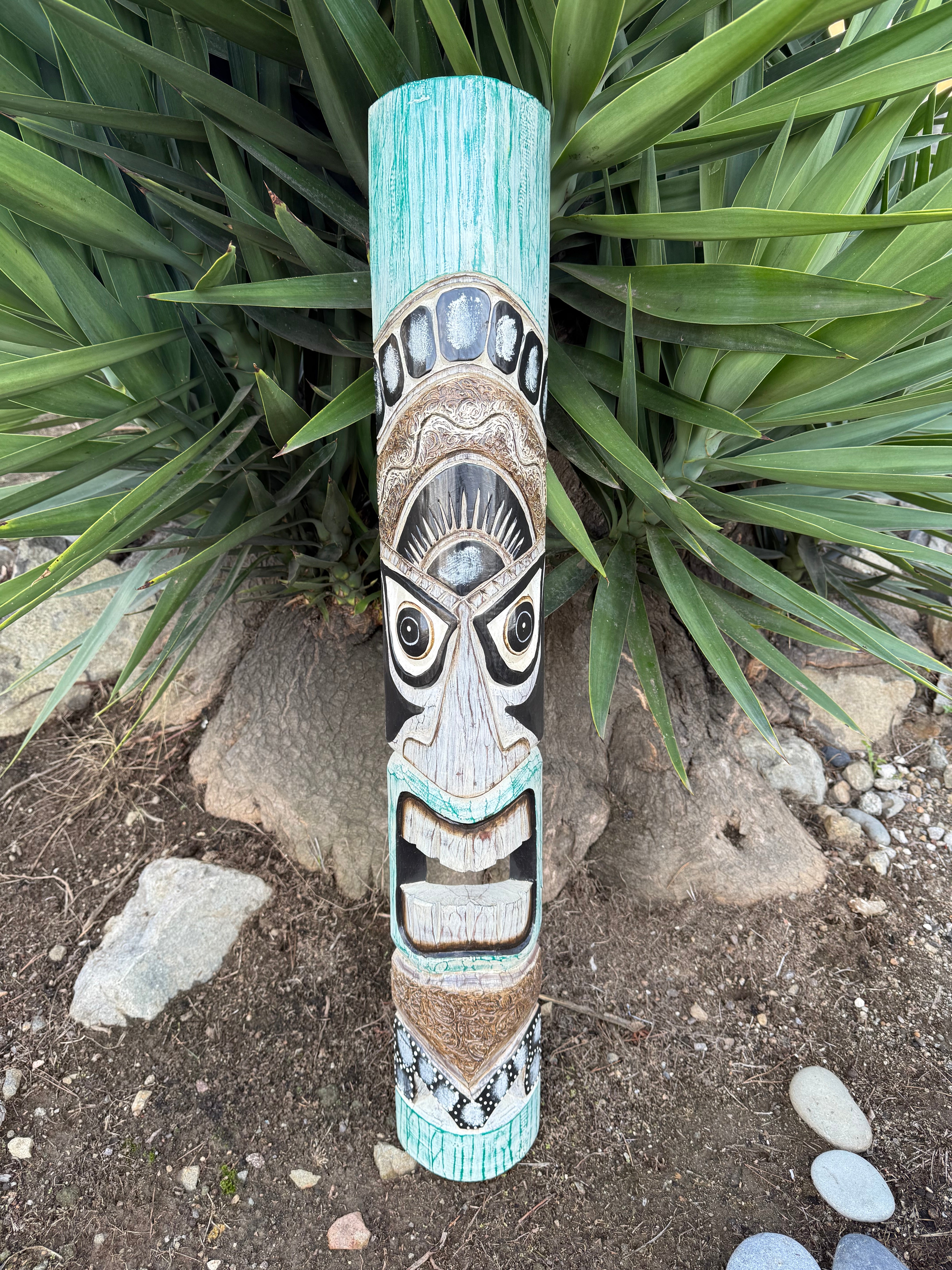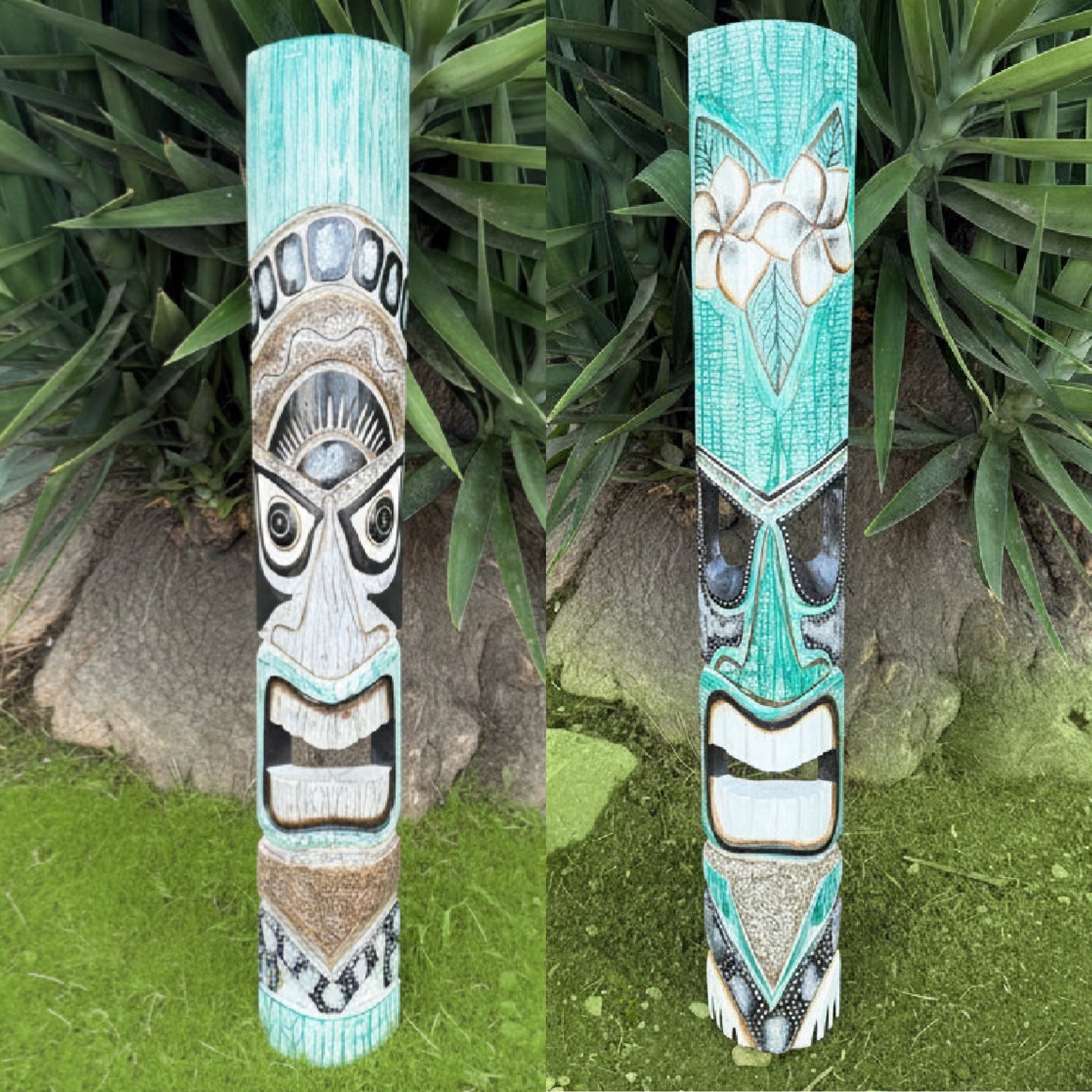 This hand-carved wooden tiki mask set would make a great addition to your home, patio, yard, or tiki bar! These masks are beautifully hand crafted and painted with nautical colors and plumeria flowers. The backs of the masks are hallowed out to fit around poles, or can be hung flat up on the wall. This mask will make a great gift, or buy it for yourself! :) 39"x 6" inches