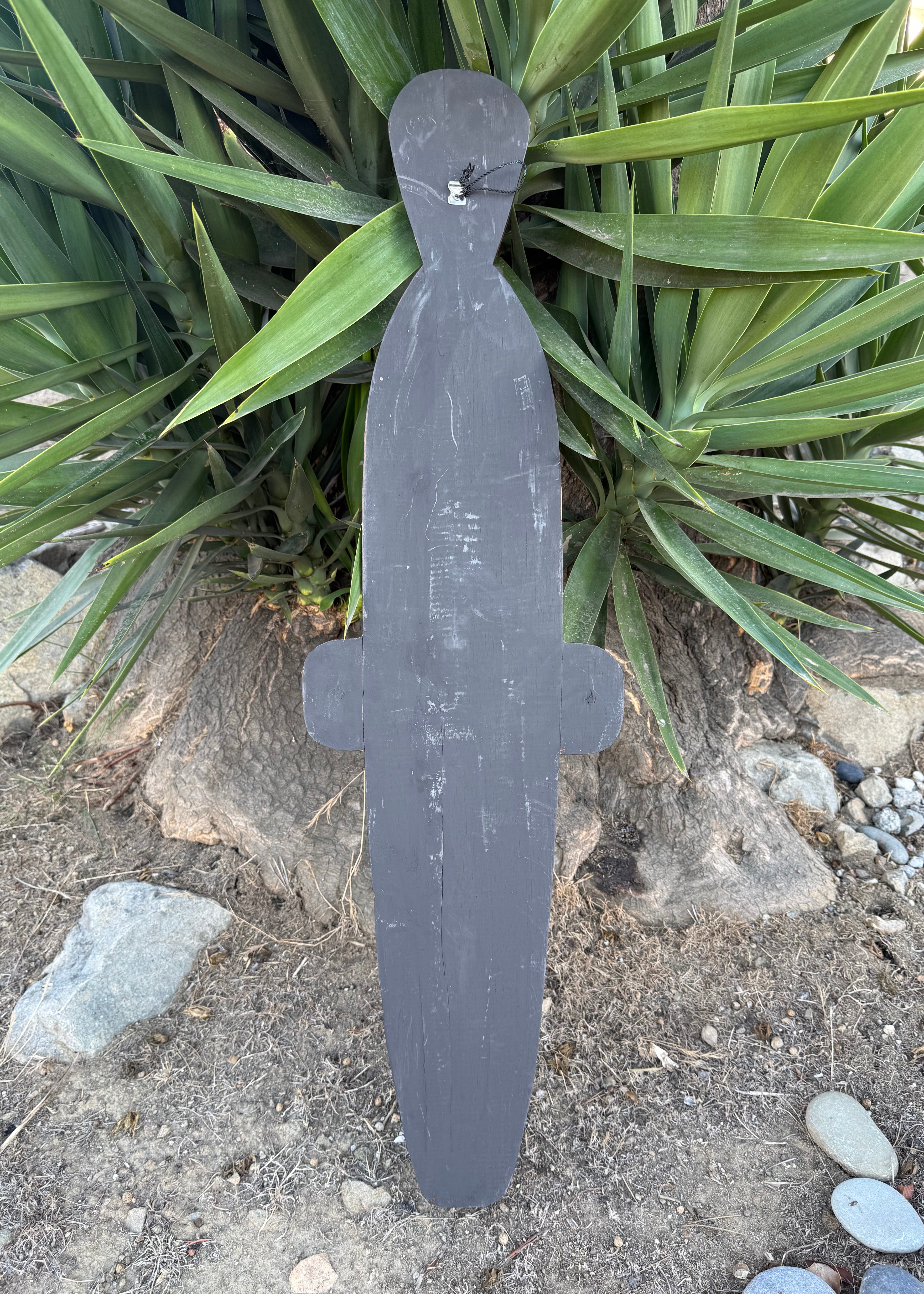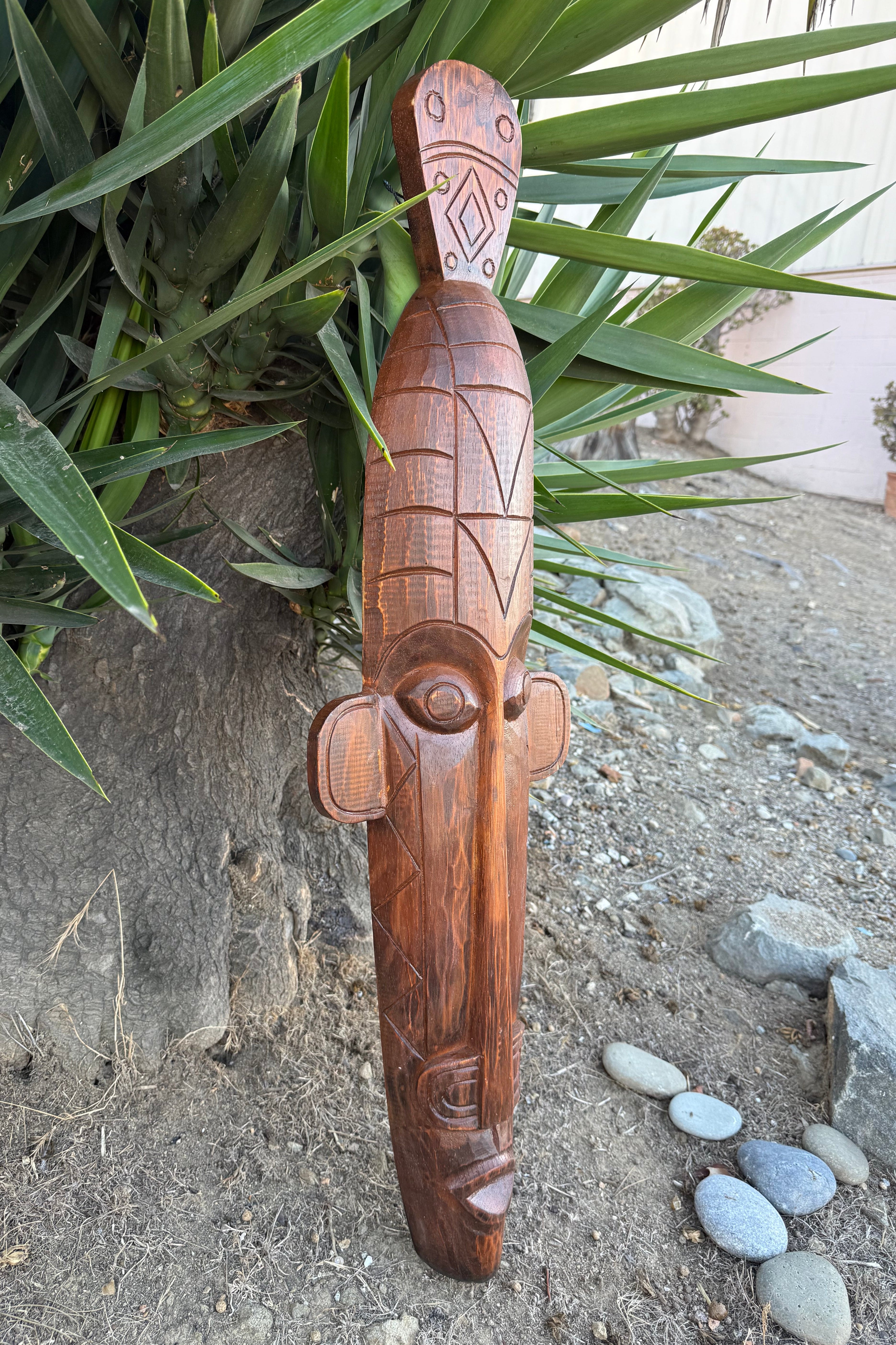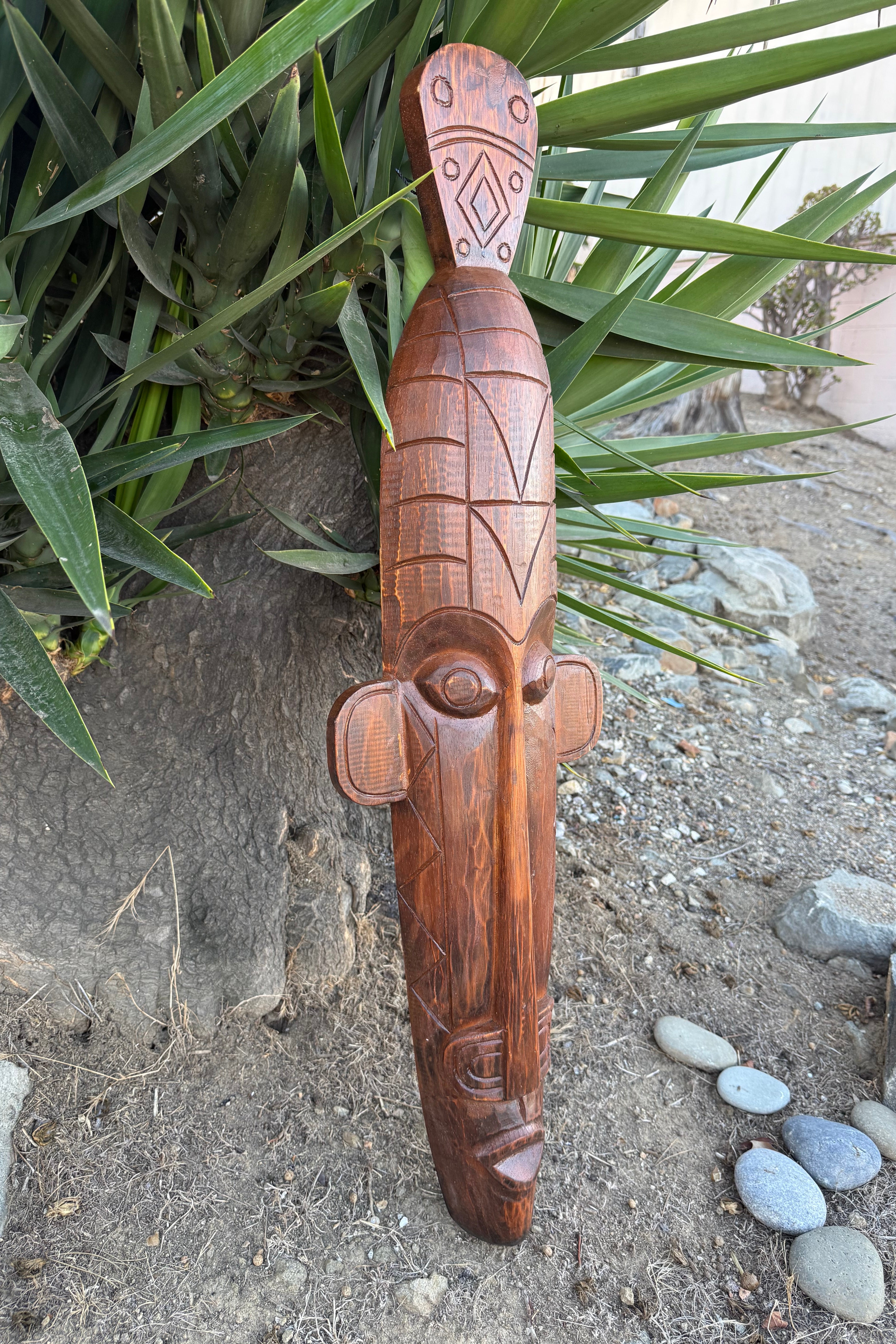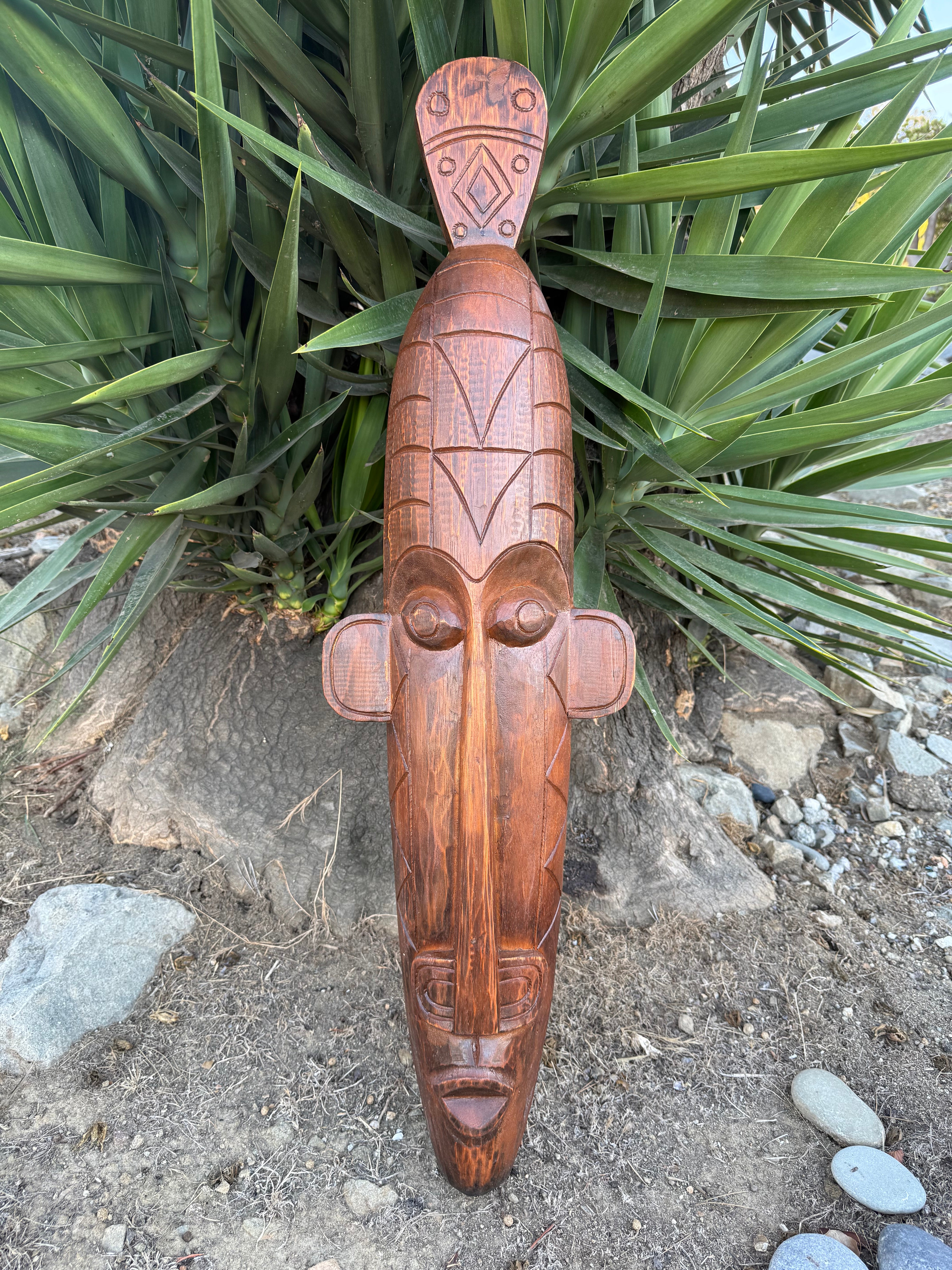 Spice up your home decor with this hand carved primitive tribal tiki mask.  Hand carved and stained from albesia wood.  This carving is flat on the back with a hanger to be hung on the wall.   These measure approximately 39"x 10".   Makes a great gift!  Or put this piece up in your own home, yard, patio, or tiki bar!