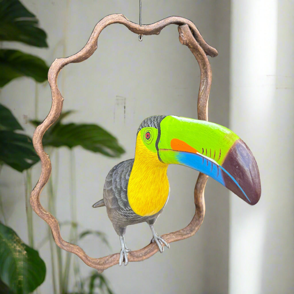 Beautiful Wood-carved Toucan. Each one is hand carved and painted, creating a one of a kind piece of art. The tropical bird sits upon a unique wooden perch that frames the carving like a vine.