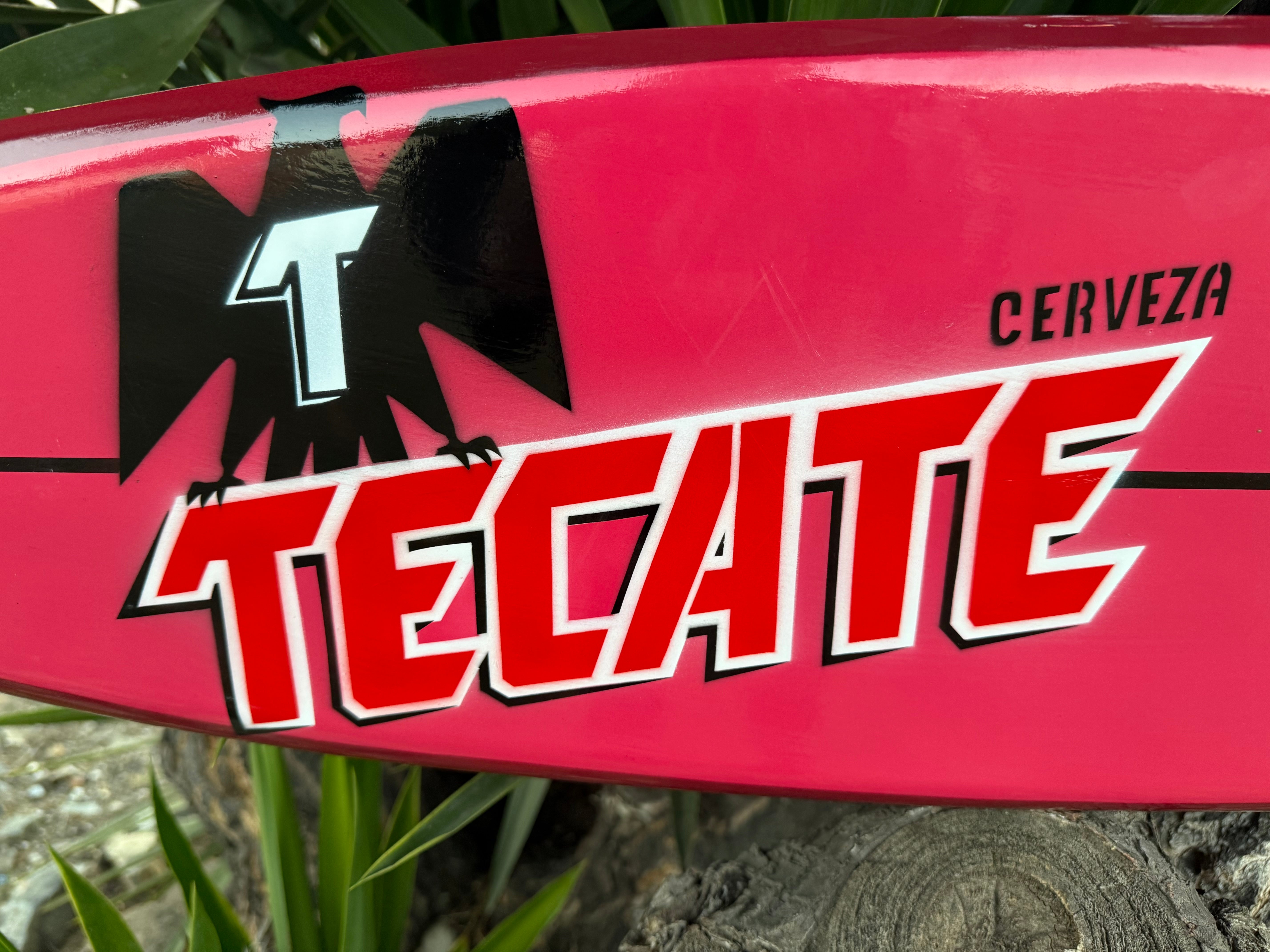 This awesome hand crafted Tacate Surfboard wall plaque would make a great addition to your home, patio, or tiki bar. It is hand carved from top-of-the-line mango wood, and has a flat back to hang on the wall. This surfboard would also make an awesome gift! 39x 10 inches