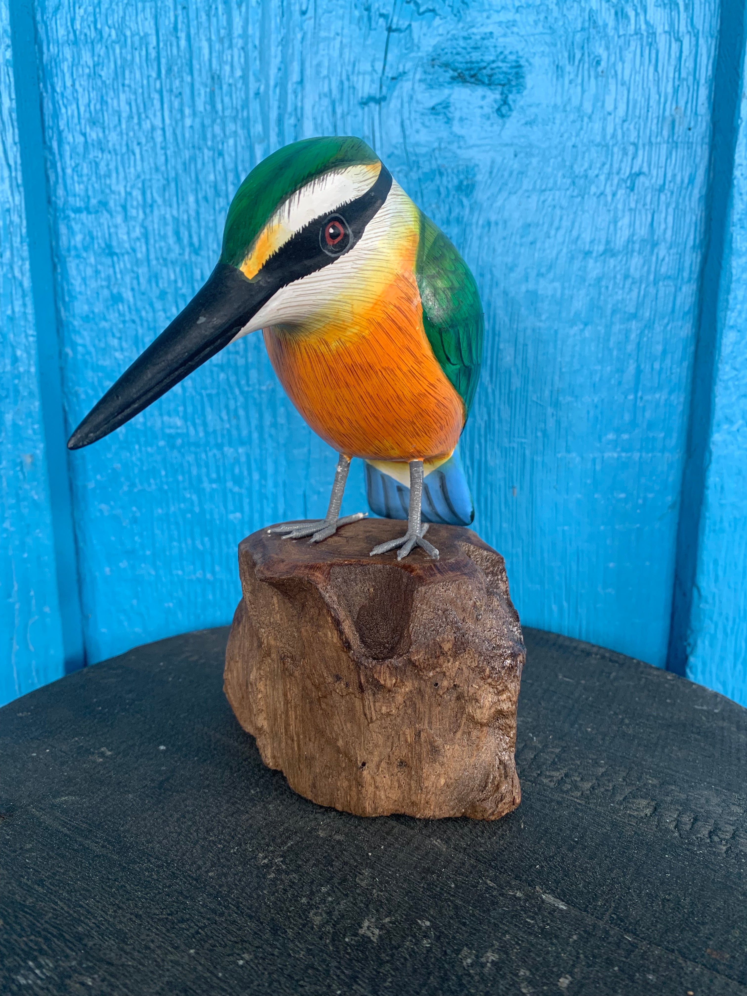 Beautiful wood-crafted Kingfisher. Each one is hand carved and painted with great detail, creating a one of a kind piece of art. The riverside bird sits upon a unique wooden tree stump made from drift wood. This would make a stunning interior decoration, or a wonderful gift for any nature lover, or bird collector. It is approximately 7" tall, 5" wide, with a 6" depth The bird itself is 6” inches from head to tail.