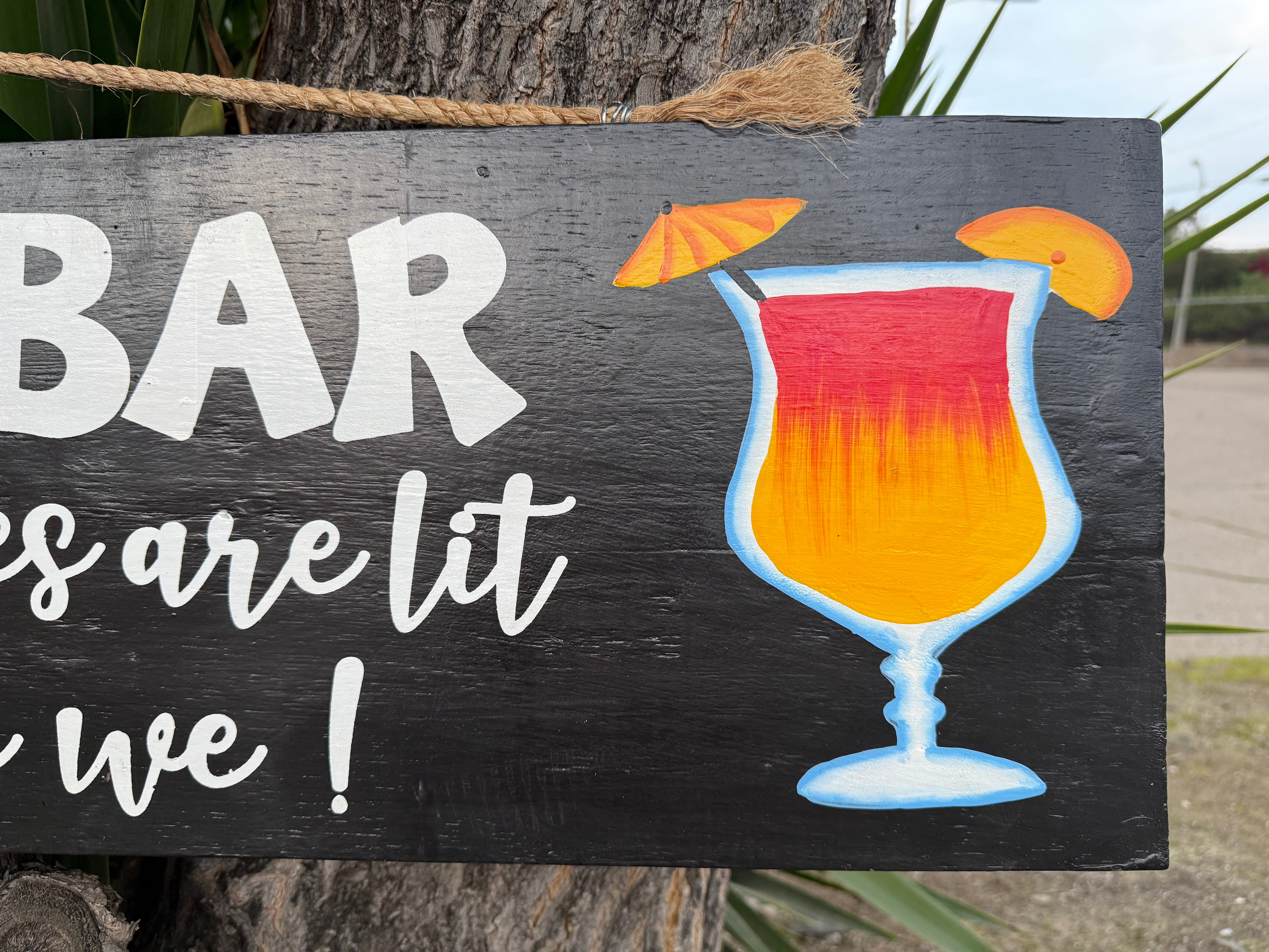 This colorful hand carved and painted tropical sign would look great in your home, patio, or tiki bar! Made from MDF wood and hand painted. This fun sign is sure to grab attention. Let the festivities begin once this sign goes up. 39" x 11”