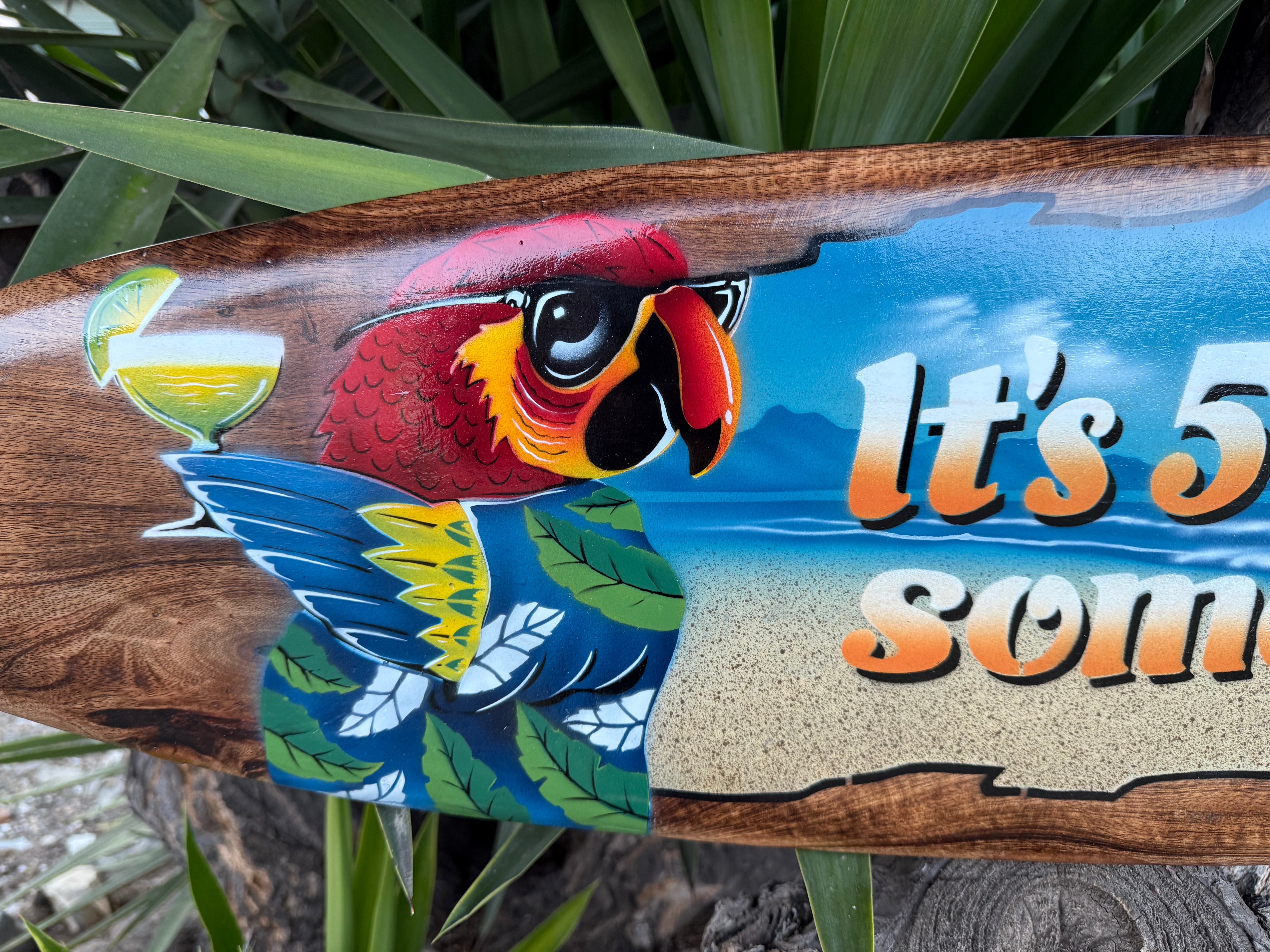It’s 5 0'clock Somewhere Drinking Parrot Airbrushed Surfboard Wall Plaque Mango Wood Tiki Bar 39"x 10"