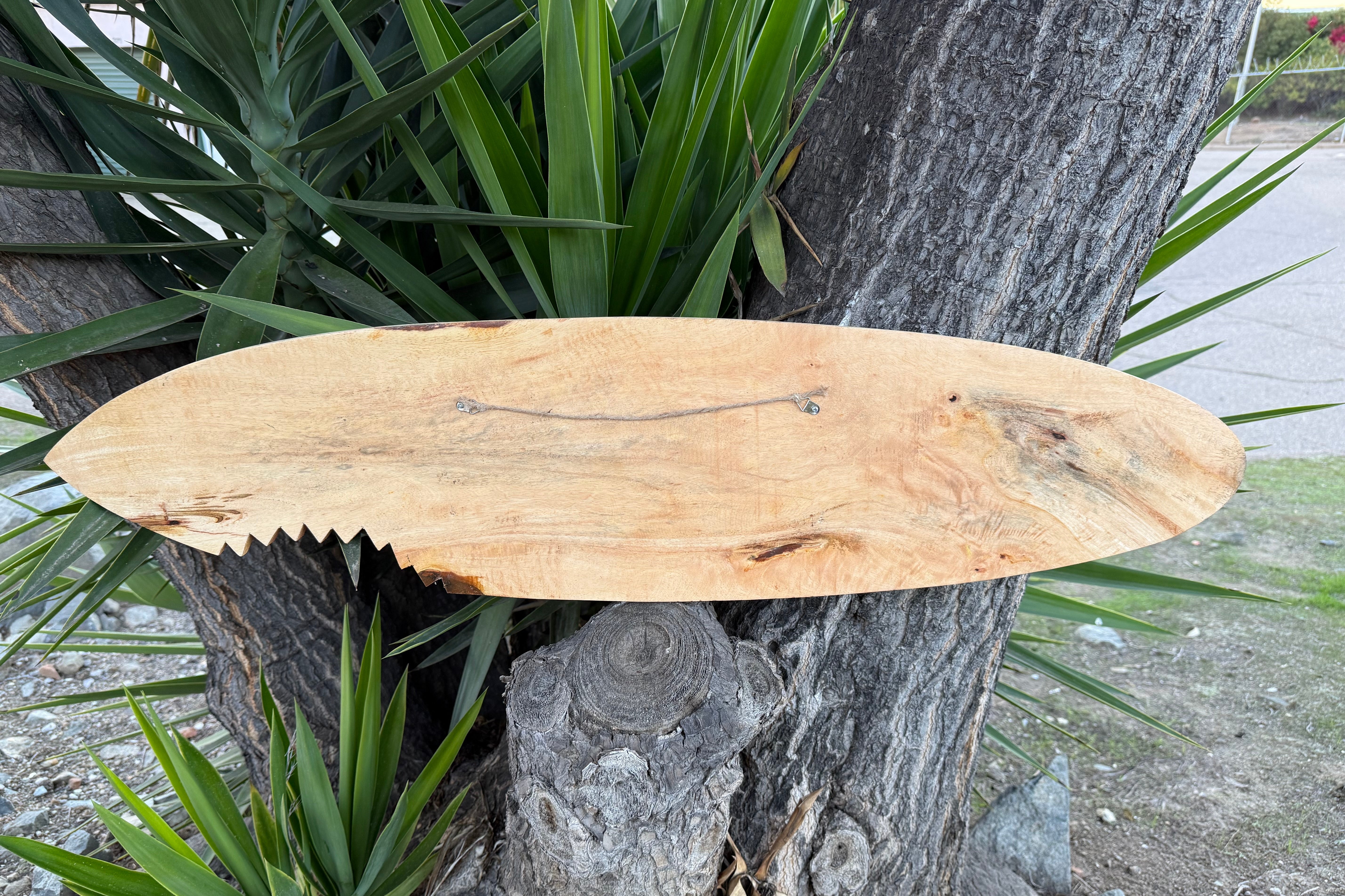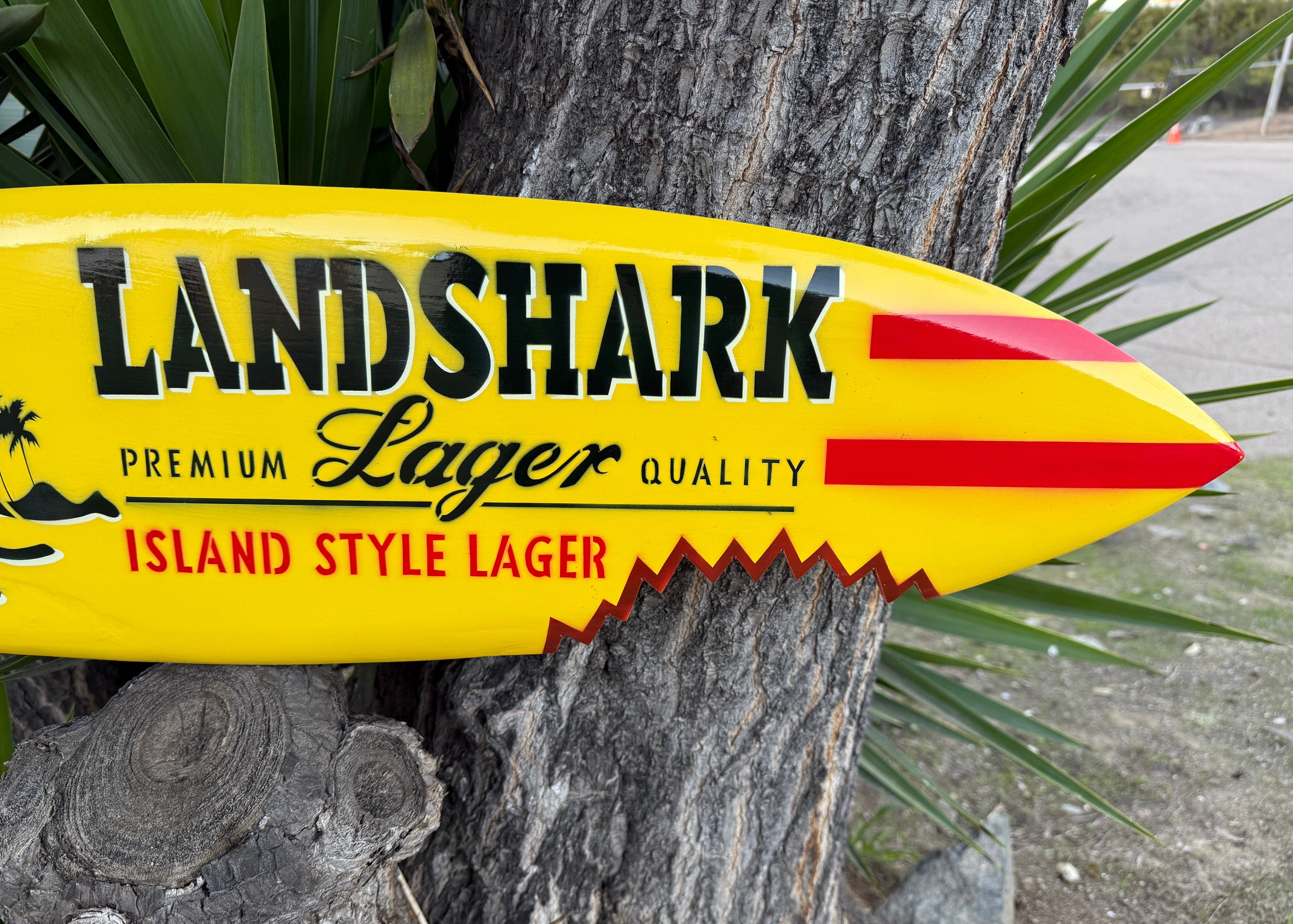 This beautiful hand crafted Landshark Surfboard wall plaque would make a great addition to your home, patio, or tiki bar. It is hand carved from top-of-the-line mango wood, and has a flat back to hang on the wall with a shark bite. Bring a taste of the islands home to you! This surfboard would also make an awesome gift! 39x 10 inches