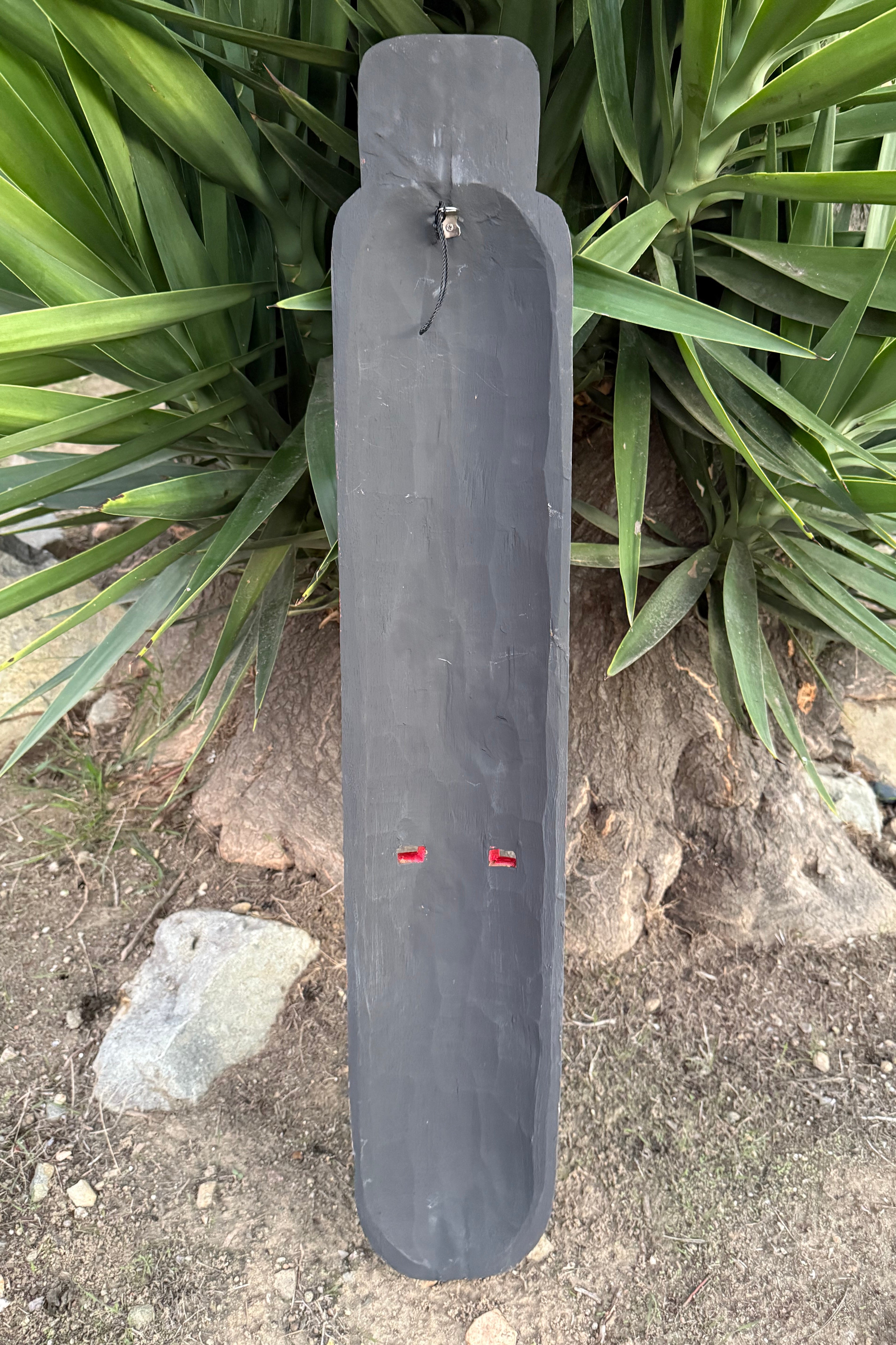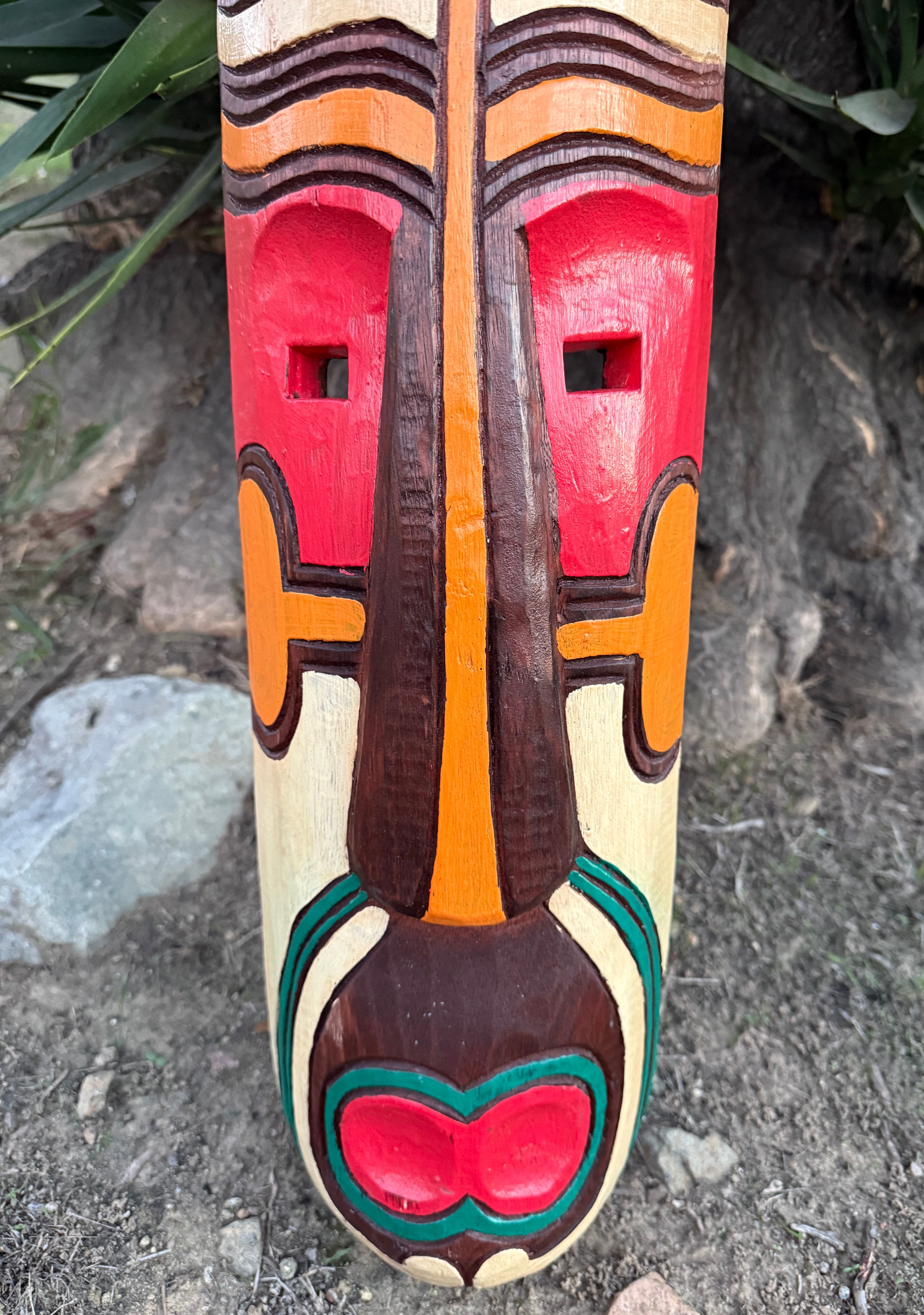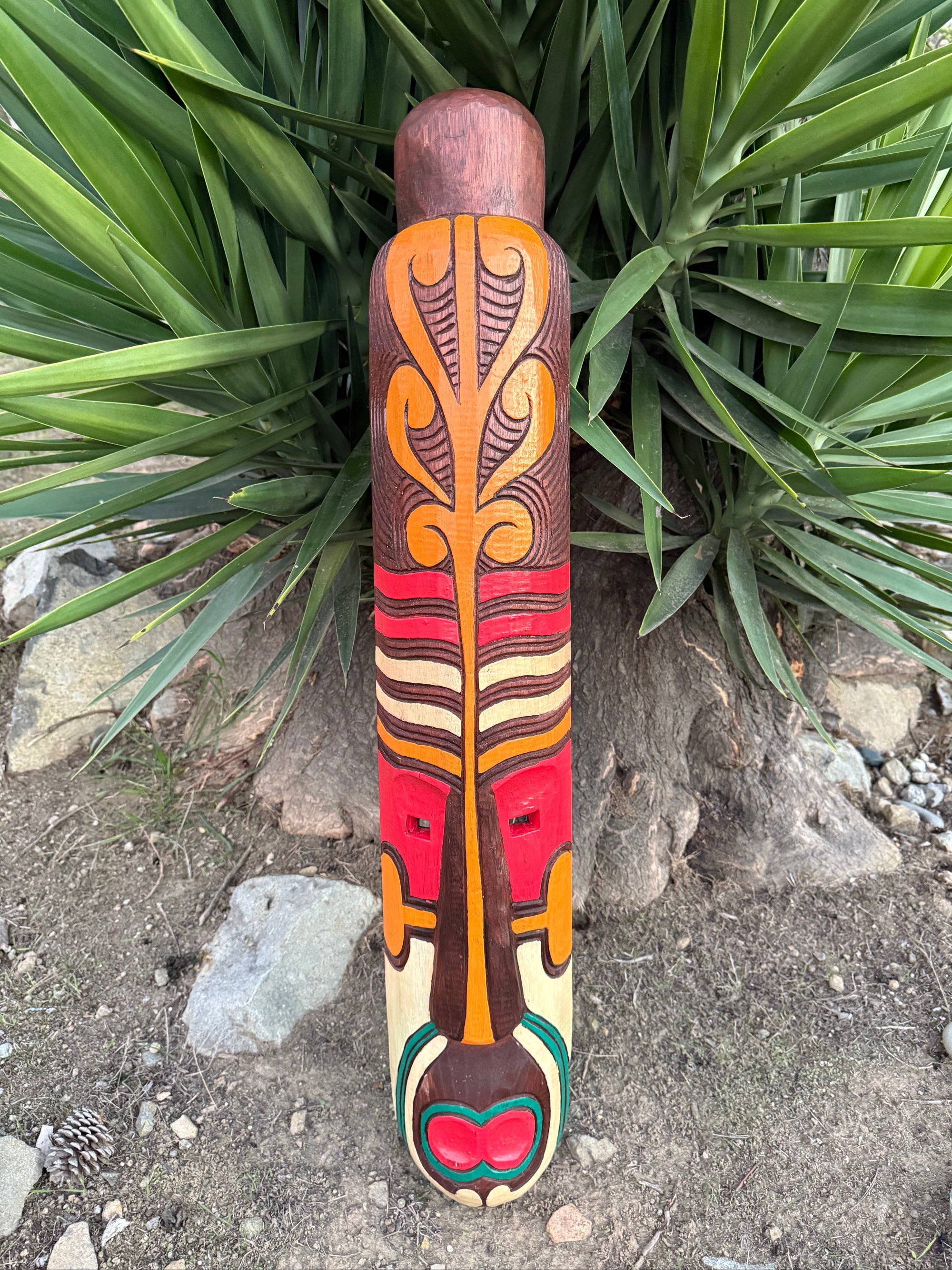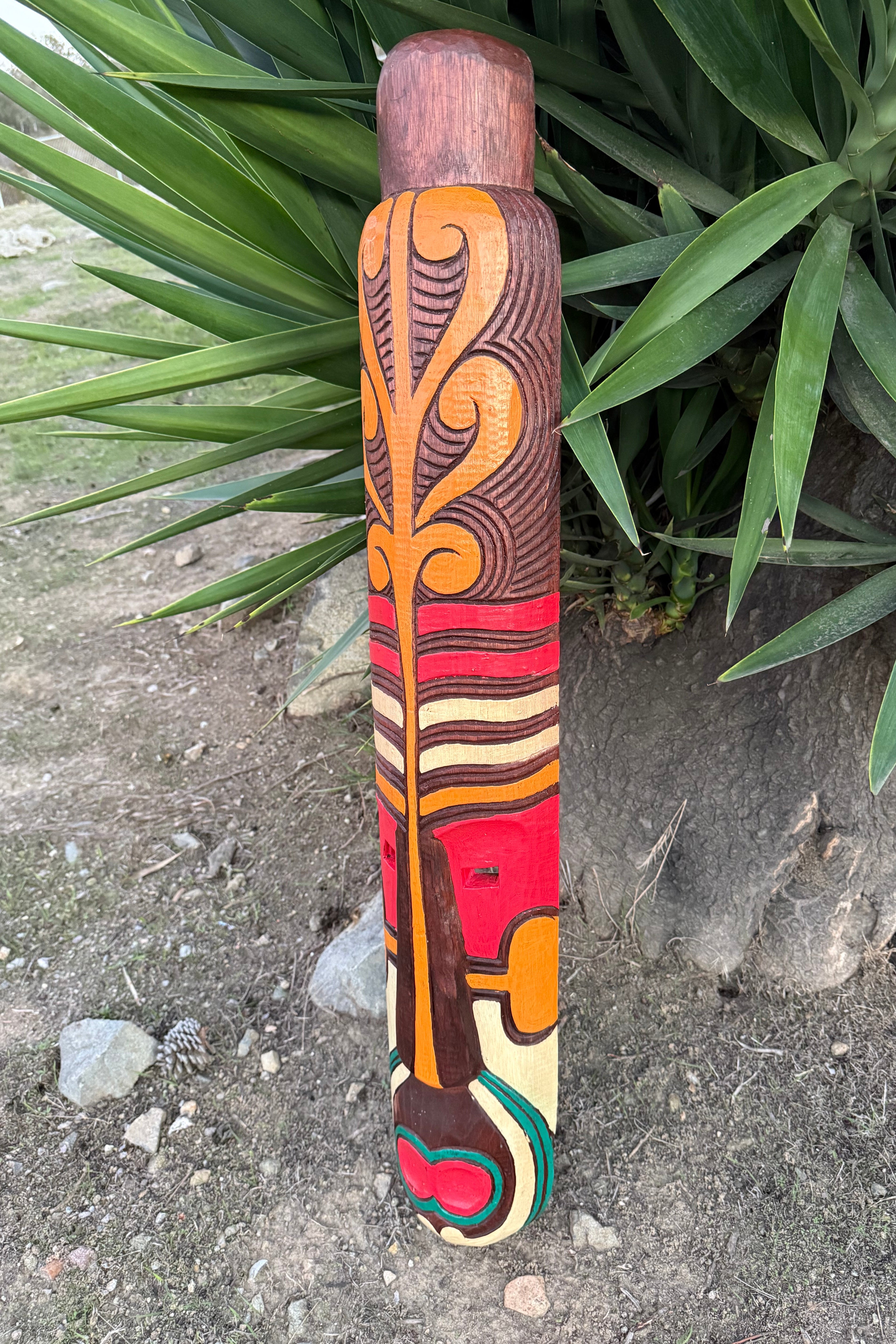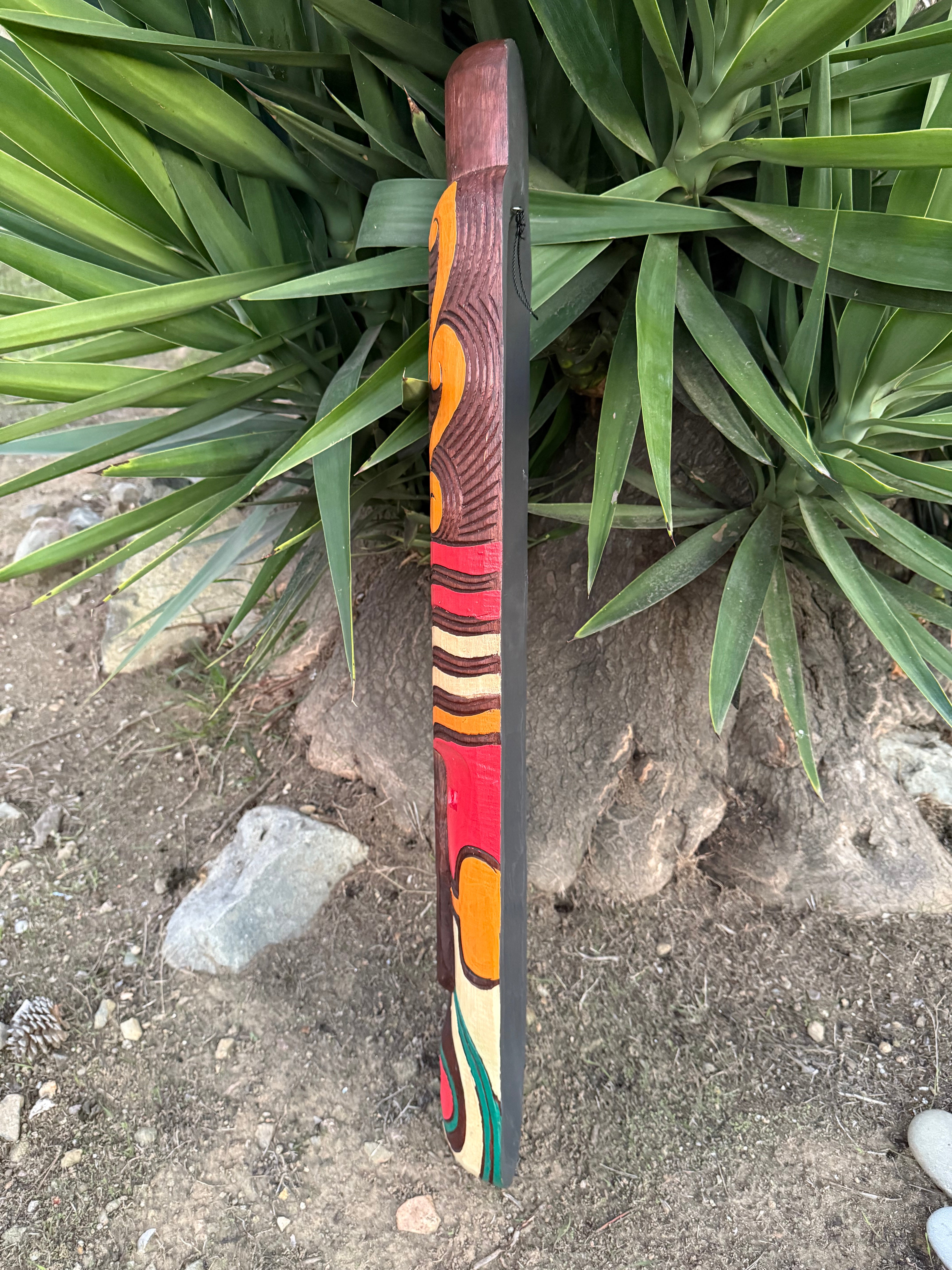 Maori style wooden tribal tiki mask inspired by the indigenous Polynesian people of New Zealand. This hand-crafted and painted mask would be a great addition to your home, patio, yard, or tiki bar. 39"x 7"