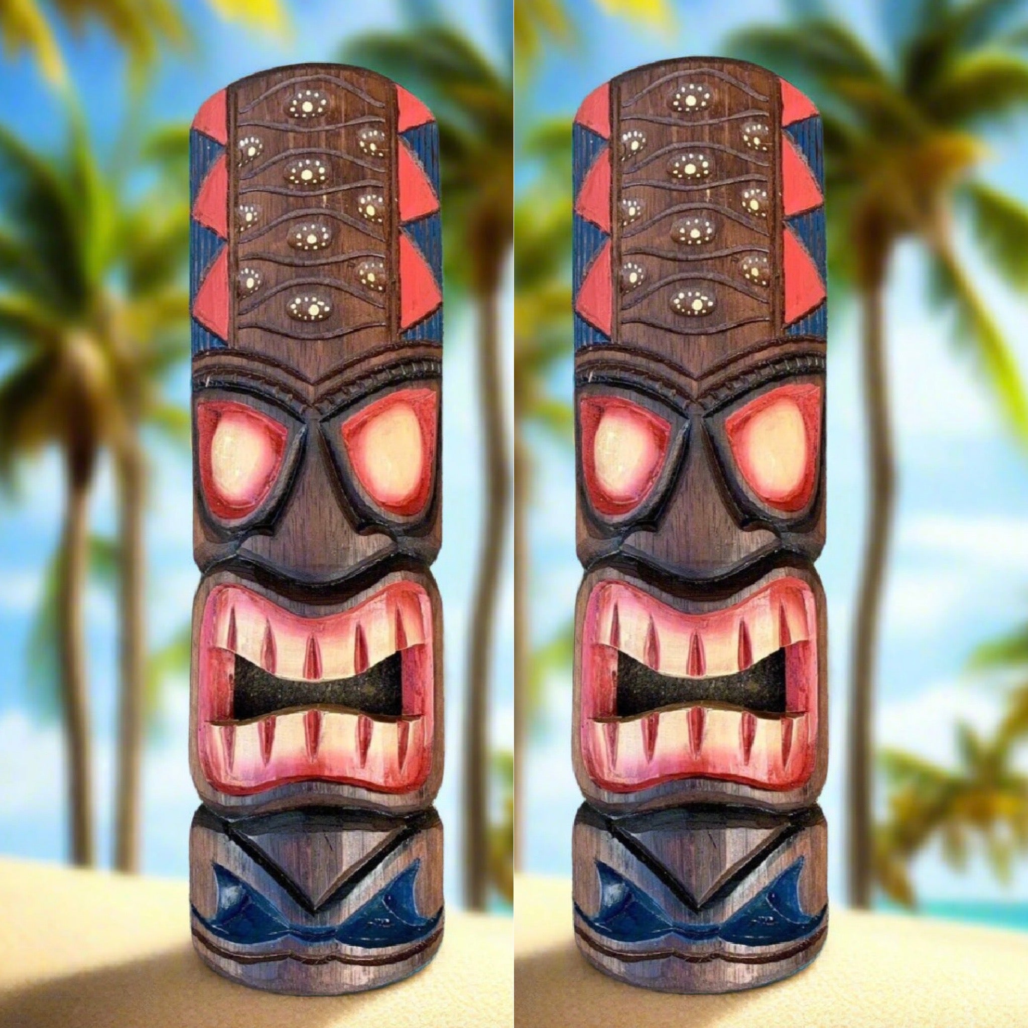 Add some tropical flavor to your home décor with this set of 2 hand-carved Tiki masks. Crafted from wood, these multi-colored masks feature a Hawaiian theme that is perfect for a island-inspired vibe.  Each set measures 20 inches in height, and 5-6 inches in width,  making them ideal for displaying on your wall or in a grouping of decorative accessories. The masks are hand carved from albesia wood and are sure to add a touch of fun and style to any space. Whether you're a fan of Tiki or simply want to add some island charm to your home, this set of masks is the perfect choice.